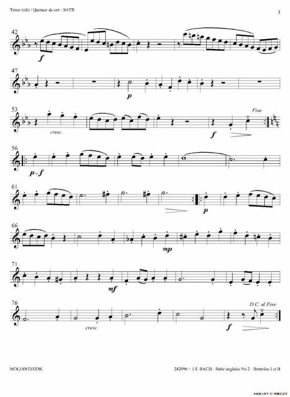 Suite anglaise No 2,BWV 807萨克斯谱(法国组曲之二·布列舞曲)(上低音萨克斯分谱),Suite anglaise No 2,BWV 807(法国组曲之二·布列舞曲)萨克斯简谱"