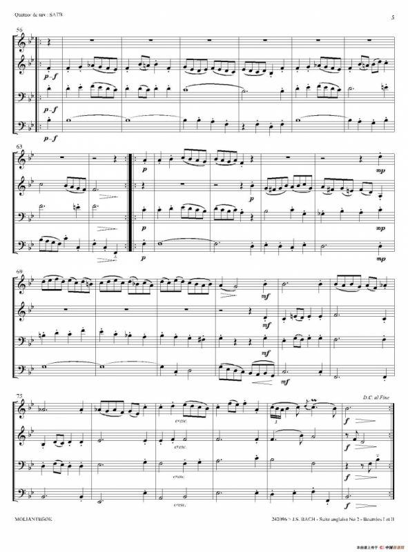 Suite anglaise No 2,BWV 807萨克斯谱(法国组曲之二·布列舞曲)(四重奏总谱),Suite anglaise No 2,BWV 807(法国组曲之二·布列舞曲)萨克斯简谱"