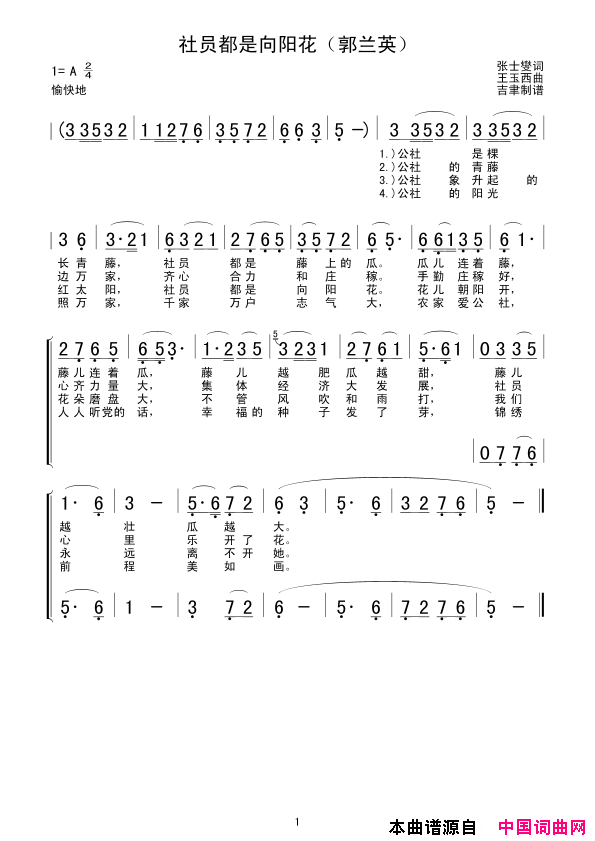 社员都是向阳花简谱,演唱郭兰英,歌词