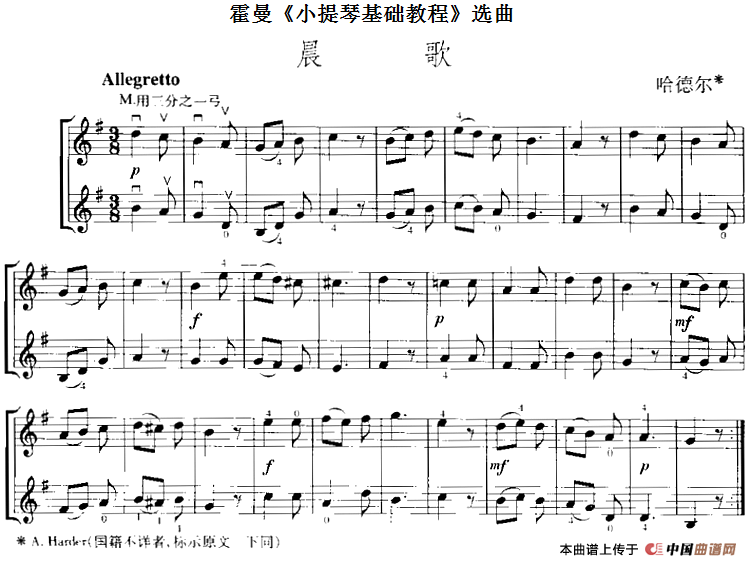 霍曼《小提琴基础教程》选曲:晨歌(二重奏)提琴谱,简谱"