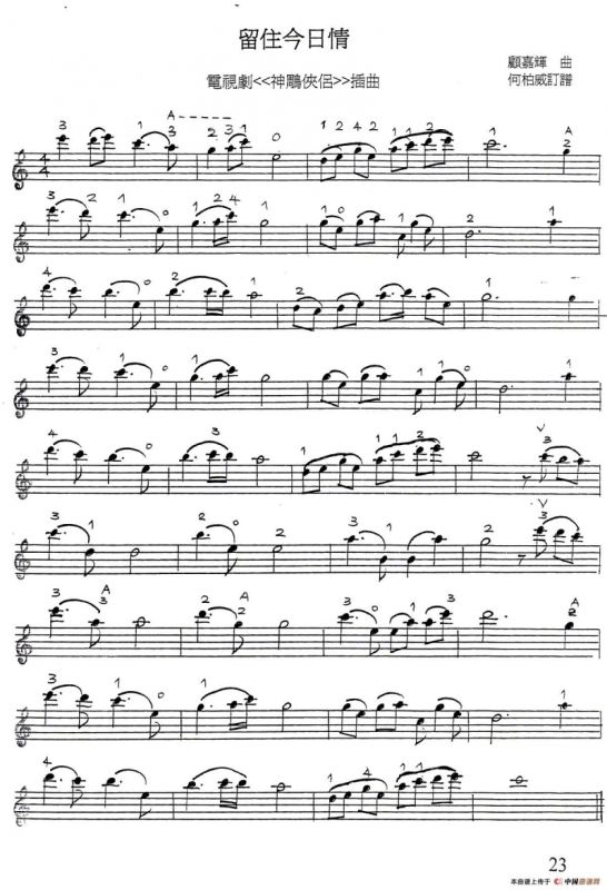 留住今日情提琴谱(电视剧《神雕侠侣》插曲),留住今日情简谱"