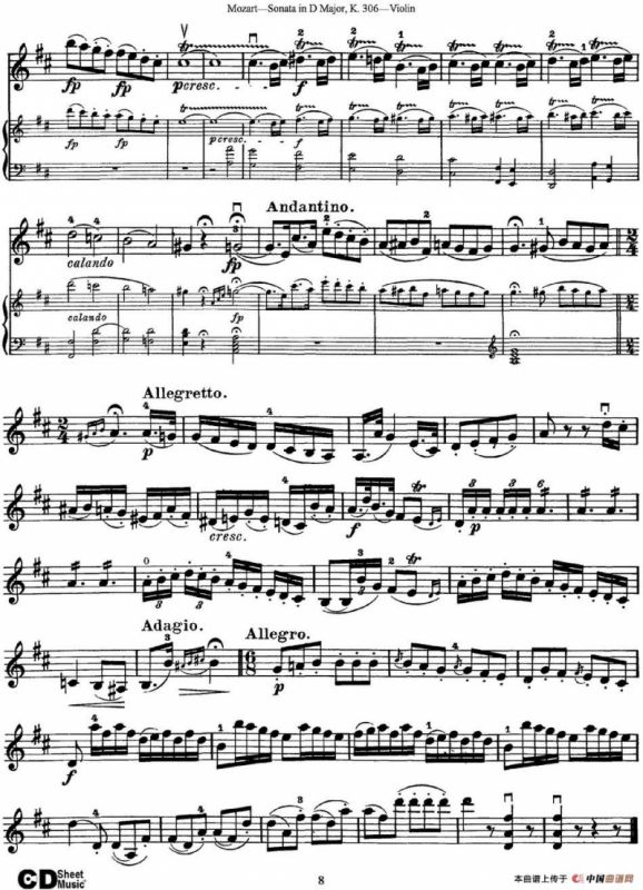 Violin Sonata in D Major K.306(小提琴+钢琴伴奏)提琴谱,简谱"
