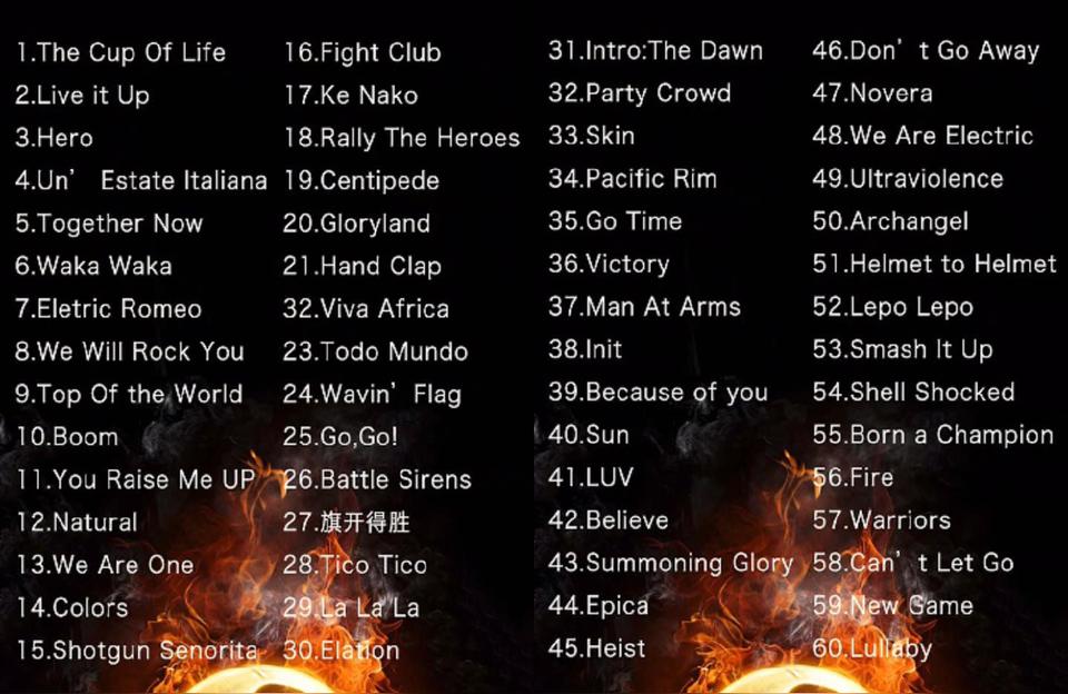 恭喜恭喜,精忠报国,霸王别姬,我的中国心,光辉岁月,真的爱你,扁扁喜欢你,神话,朋友,天路,山路十八弯,为了谁,不如跳舞,等一分钟,没有钱你会爱我吗,纤夫的爱,哥哥面前有条弯弯的河,刀剑如梦,万疆,笑纳,听闻远方的你,少年,我的未来不是梦,我是一只小小鸟。