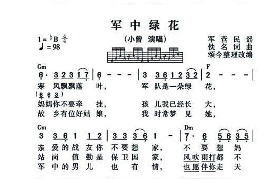 寒风飘飘落叶,军队是一朵绿花,亲爱的战友你不要想家,不要想妈妈,声声我日夜呼唤,军旅生活,多少句心里话,不要离别时两眼泪花,军营是咱温暖的家,妈妈你不要牵挂,孩儿我已经长大,站岗值勤是保卫国家,风吹雨打都不怕,衷心的祝福妈妈,愿妈妈健康长寿,待到庆功时再回家,再来看望好妈妈,故乡有位好姑娘,我时常梦见她,军中的男儿也有情,也愿伴你走天涯,只因为肩负重任,只好把爱先放下,白云飘飘带去我的爱,军中绿花送给她。